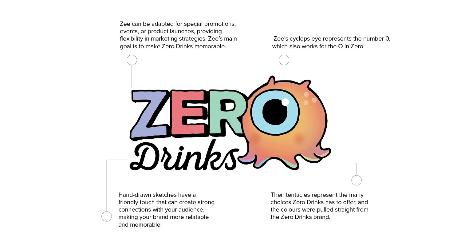Zee's cyclops eye represents the number 0, which also works for the O in Zero. Their tentacles represent the many choices Zero Drinks has to offer, and the colours were pulled straight from the Zero Drinks brand. Zee can be adapted for special promotions, events, or product launches, providing flexibility in marketing strategies. Zee's main goal is to make Zero Drinks memorable.